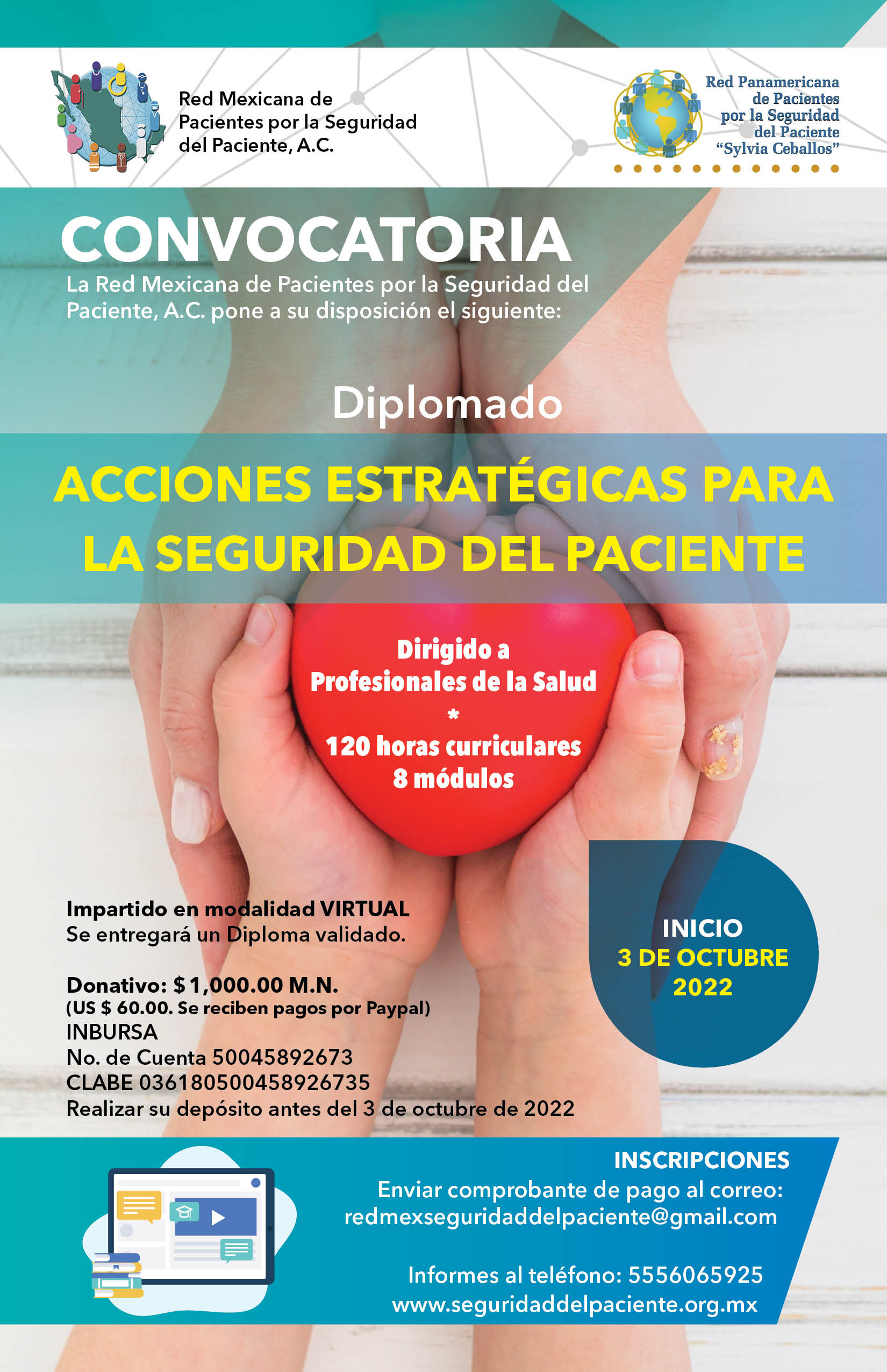 La seguridad del paciente es un tema prioritario y de preocupación a nivel mundial, debido a los errores que se comenten día a día en la atención que se le proporciona a los pacientes dentro de los establecimientos de salud, implicando elevar los costos económicos y la estancia hospitalaria. Derivado de esta problemática y con la finalidad de apoyar esta política de relevancia mundial, la Asociación Red Mexicana de Pacientes por la Seguridad del Paciente en México y la Red de Latino América, se da a la tarea de ofertar este Diplomado con la finalidad de permear el conocimiento al personal de salud en beneficio de la población.